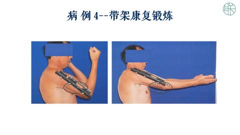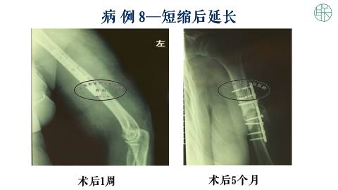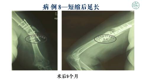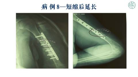那么这个时候,我们可以采用把肱骨直接短缩。然后我们设计一个,延长的外固定支架。加压十天以后,重新延长。这样可以获得,我们需要的长度,也可以得到骨的愈合。