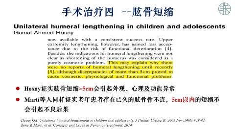 但最近这几年,文献报道认为,肱骨的短缩,不能超过5厘米。假如在5厘米内的短缩,它不会引起肩肘关节的功能以及障碍。