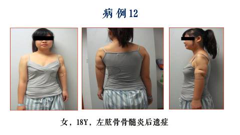 她小时候8岁的时候,得了肱骨骨髓炎。现在十年过去了,发育的后果,大家可以看到,左上臂严重的短缩。