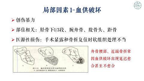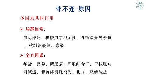 从大的方面可以包含着全身因素和局部因素。局部因素主要是局部的血运障碍,机械力学稳定性,还有骨断端的分离移位,还有软组织的嵌顿,还有感染;