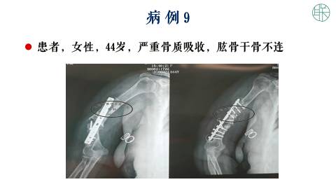 我们看一个病例,这是一个女性44岁,严重的骨质吸收,肱骨干的骨不连。