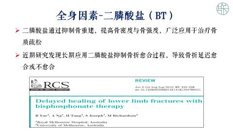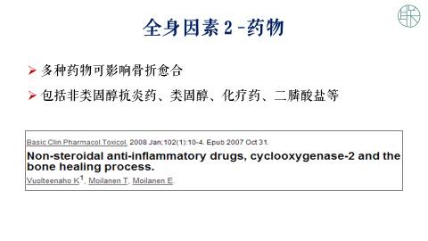 那么全身因素,除了年龄营养状态以外,还有糖尿病,库欣综合征,甲状腺功能减退。还有一些药物,比方讲化疗药,非甾体类抗炎药,都对骨折的愈合会有一定的影响。