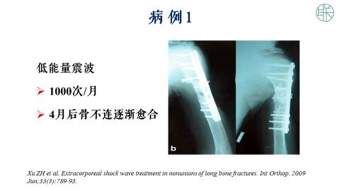 我们采用了低能量震波,可以看到每月1000次,然后四个月后,骨不连就逐渐的变成了一个骨的愈合。这是低能量震波,还是证明有效的。