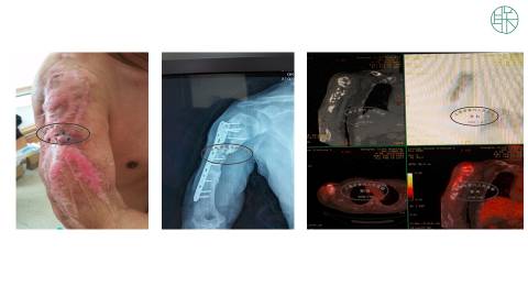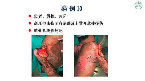 我们现在遇到的问题,除了右肩部,皮肤软组织缺损以外,还有一个,肱骨长段的骨坏死。