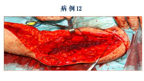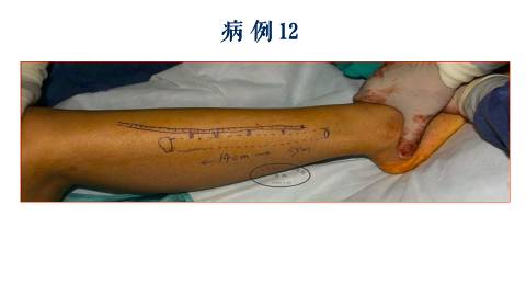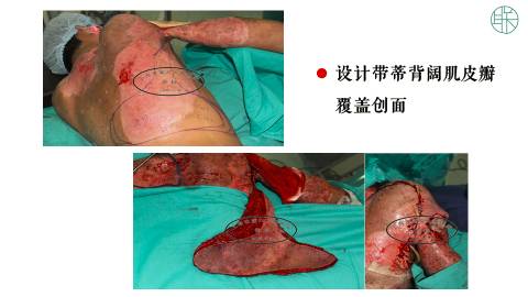 我们首先利用,显微外科的技术,设计一个代替的背阔肌皮瓣,覆盖这个肩部的骨外露的创面,然后同时切取一个游离腓骨的皮瓣。