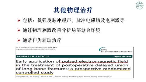 当然还有其他很多物理方法,包括低强度的脉冲超声,脉冲电磁场以及电刺激等。这些物理刺激,它主要的作用在于改善骨折局部的愈合环境。这些都是我们一些其他的辅助治疗。