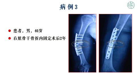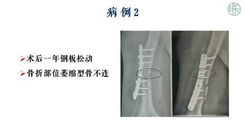 第二个病例,这是一个男性40岁,也是肱骨干骨折,术后两年,产生了骨不连,当然还有钢板的断裂。