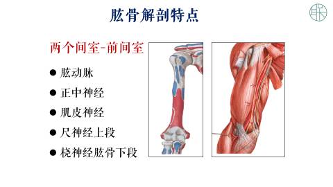 第一个就是前间室,它包含了肱二头肌的肌腹和部分肌腱。当然这里头更重要的是有肱动脉、正中神经、尺神经上段、还有桡神经的肱骨下段,当然还有一个肌皮神经。肌皮神经是在中上段,主要是支配肱二头肌的肌肉,引起屈肘功能。