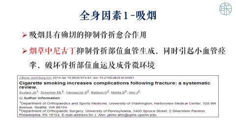 大家知道,吸烟具有确切的抑制骨折愈合的作用。文献报道烟草中的尼古丁,它是抑制骨折部位的血管生成,同时,会引起小血管的痉挛,破坏骨折部位血运,以及成骨的微环境。
