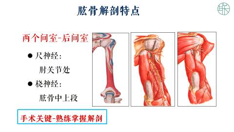 我们回过头来看看,肱骨的解剖特点,也可以加深这方面的理解。肱骨干包含的就是我们所谓的上臂。在这个上臂中,我们把它分成两个间室。