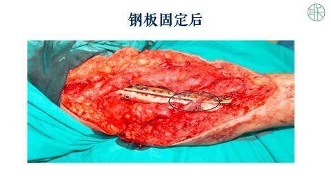 我们手术中,一定要注意避免钢板加植骨。也可以用动力加压钢板+自体植骨;也可以用锁定钢板+自体植骨。