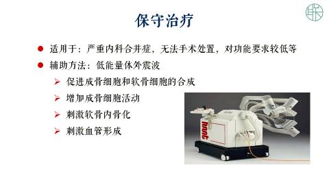 保守治疗,实际上我们选择的时候,可能是对那些严重的内科并发症的病人,没办法手术处理,而对功能要求较低的病人,我们这时候,首先要考虑保守治疗。