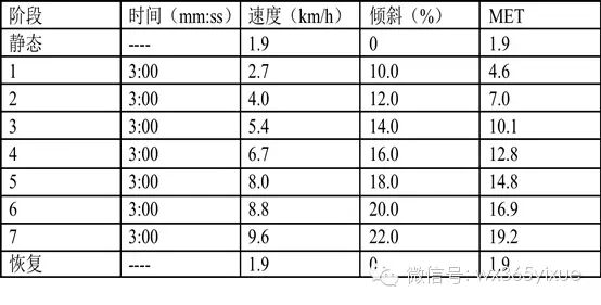 通常运动试验的方案有多种,大多数方案依据Bruce方案修改,运动时间一般为6-12min。运动能力应该以代谢当量(METs)表示,同时应报告患者运动的持续时间。运动试验常常在患者达到最大预测心率时终止,但是,在运动试验过程中,有可能发生ST段异常和胸痛等临床症状、心率、血压的改变。因此,必须考虑其他的运动试验终点。