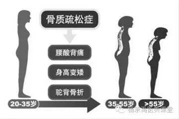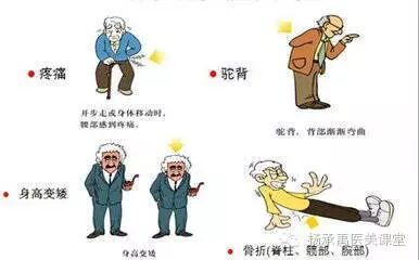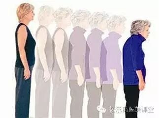 (2)驼背:表现为身高缩短,背曲加重。脊柱椎体结构95%由松质骨组成;因骨量丢失,骨小梁萎缩,使椎体疏松即脆弱,负重或体重本身的压力使椎体胺压变扁致胸椎后突畸形,驼背多发生于胸中下段。女性65岁时比自身最大身高短缩4cm以上,75岁时短缩达9cm以上。