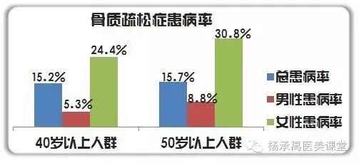 我国现有老年人口1.3亿,预计2050年将达2亿5千万,其中25%~70%患有骨质疏松。无论男性或女性在49岁以前骨质疏松症的患病率均在10%以内,而50岁以后患病率明量增加,女性为著,以累积丢失率最快的两个部位统计,50岁以上女性约为30%~40%,男性20%~30%;60岁以上女性约为60%~70%,男性25%~35%,70岁以上女性达80%~90%,男性48%~56%;80岁以上女性达85%~100%,男性达50%~65%。