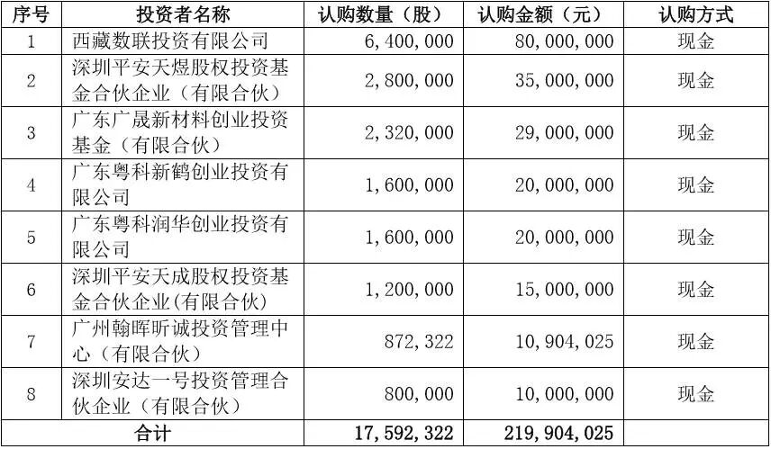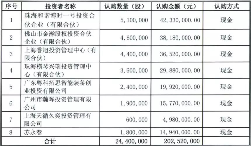 3. 2016年11月3日,以每股8.30元,发行2440万股,募集资金2.025亿元。本次股票发行对象合计8名机构投资者: