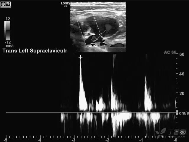 图 3 横断面频谱多普勒声像图显示病灶内有 2 处与静脉交通(仅显示 1 处),可见双向静脉血流频谱,肿物未与动脉直接交通,但频谱波形提示可能受左上肢动静脉瘘影响