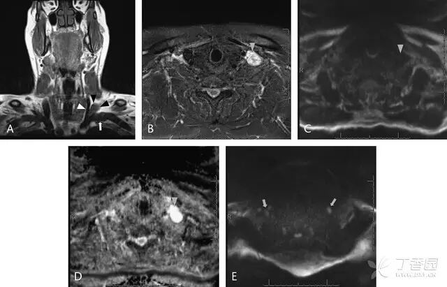 图 1 颈部 MRI 图像:A,冠状面 T1 序列显示左侧颈内静脉(白短箭头)和锁骨下静脉(白长箭头)交汇处可见一低信号肿物(黑短箭头);B,轴位短时反转恢复序列显示此肿物 T2 高信号(灰短箭头);C~E 为 DWI 和 ADC 成像,显示肿物未表现弥散受限(灰短箭头),这一特征可与来自其他部位的颈部淋巴结(灰箭头)相区分