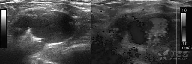 图 2 颈部横断面灰阶和彩色多普勒声像图显示一分叶状薄壁囊性结构,内见血流信号