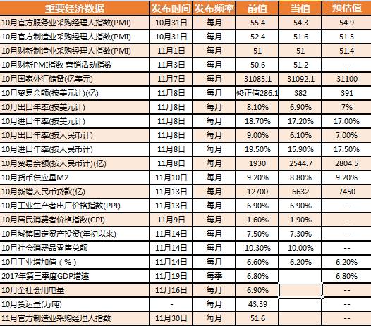 10月社会消费品零售总额34241亿元,同比名义增长10%,预期增10.4%,前值增10.3%;1-10月,社会消费品零售总额297419亿元,同比增长10.3%,1-9月为10.4%。1-10月,全国房地产开发投资同比名义增长7.8%,增速比1-9月份回落0.3个百分点;商品房销售面积同比增8.2%,续创2015年以来,增速比1-9月回落2.1个百分点。1-10月,全国固定资产投资(不含农户)517818亿元,同比增长7.3%,增速比1-9月份回落0.2个百分点。从环比速度看,10月份比9月份增长0.52%。