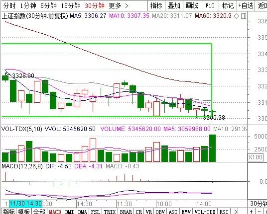 市场30分钟走势,出现明显下引线的小k线指数企稳的概率加大。但是考虑到创业板的整体已回落相当长一段时间,创业板可以参考越跌越关注的操作手法去操作。