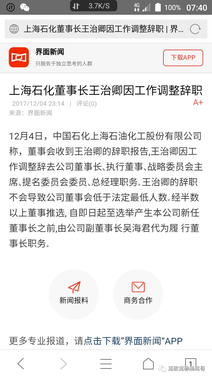 于 2017 年 12月 4日收到王治卿先生的辞职报告,王治卿先生因工作调整辞去本