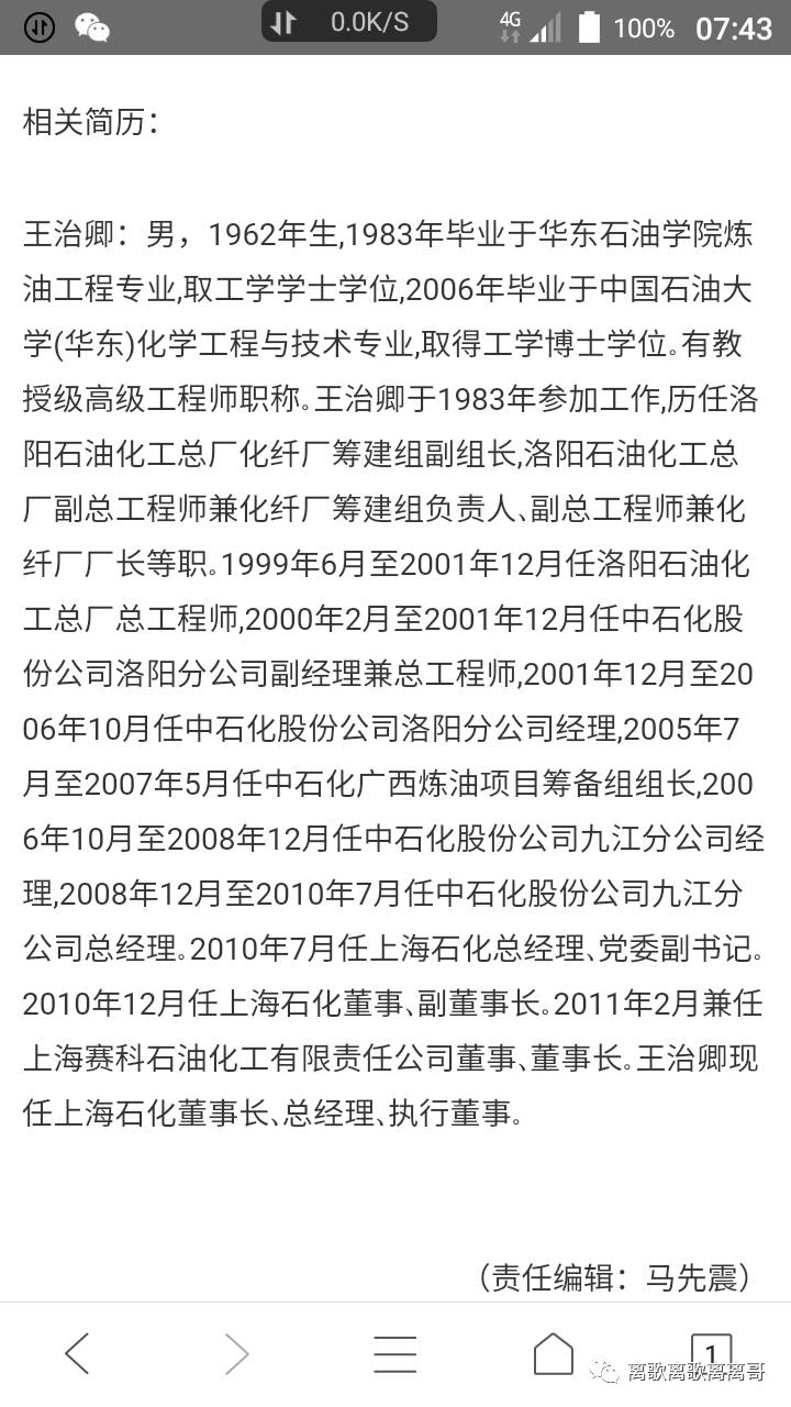 王治卿:男,1962年生,1983年毕业于华东石油学院炼油工程专业,取工学学士学位,2006年毕业于中国石油大学(华东)化学工程与技术专业,取得工学博士学位。有教授级高级工程师职称。王治卿于1983年参加工作,历任洛阳石油化工总厂化纤厂筹建组副组长,洛阳石油化工总厂副总工程师兼化纤厂筹建组负责人、副总工程师兼化纤厂厂长等职。1999年6月至2001年12月任洛阳石油化工总厂总工程师,2000年2月至2001年12月任中石化股份公司洛阳分公司副经理兼总工程师,2001年12月至2006年10月任中石化股份公司洛阳分公司经理,2005年7月至2007年5月任中石化广西炼油项目筹备组组长,2006年10月至2008年12月任中石化股份公司九江分公司经理,2008年12月至2010年7月任中石化股份公司九江分公司总经理。2010年7月任上海石化总经理、党委副书记。2010年12月任上海石化董事、副董事长。2011年2月兼任上海赛科石油化工有限责任公司董事、董事长。王治卿现任上海石化董事长、总经理、执行董事。
