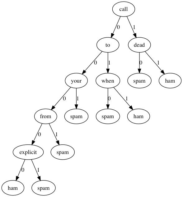 我们还是用Graphviz可视化看一下决策树都选取了那些词条作为判别标准(这时候决策树的好处就体现出来了)。