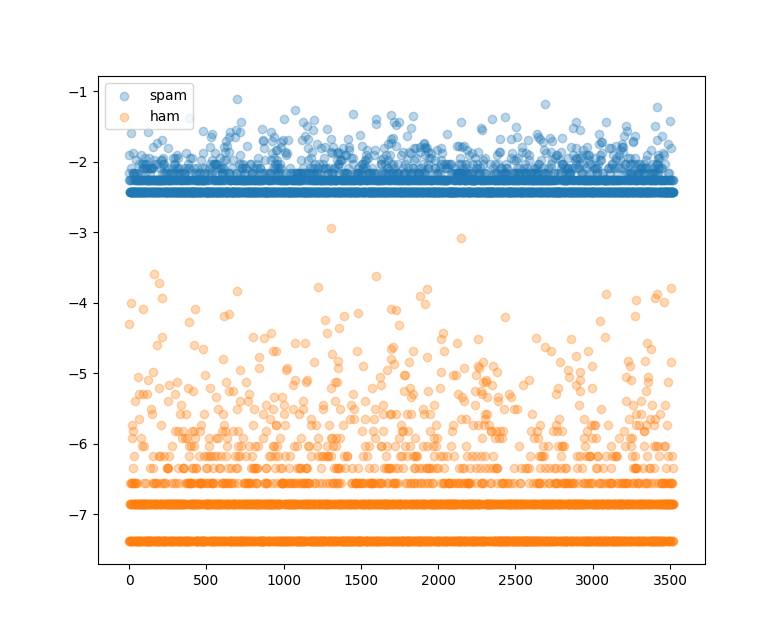 测完了我们尝试下看看不同类型短信各个词条的概率分布是怎样的吧: