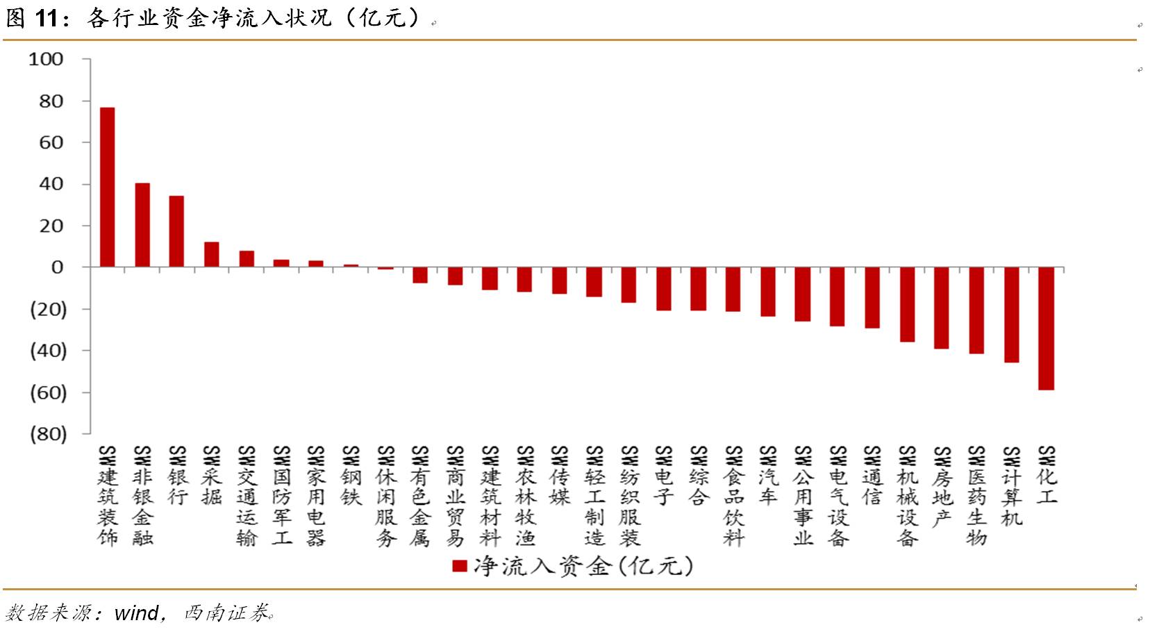 行业资金净流出依旧严重。本周申万28个一级行业中有8个行业有资金净流入,分别为建筑装饰、非银金融、银行、采掘、交通运输、国防军工和钢铁。虽然相比上周资金流入行业有所增加但是总体行业资金净流出依旧严重。净流出规模最大的三个行业分别为医药生物、计算机和化工,净流出规模分别为41.4亿元、45.6亿元和58.8亿元。行业总体净流出规模较上周有所扩大。