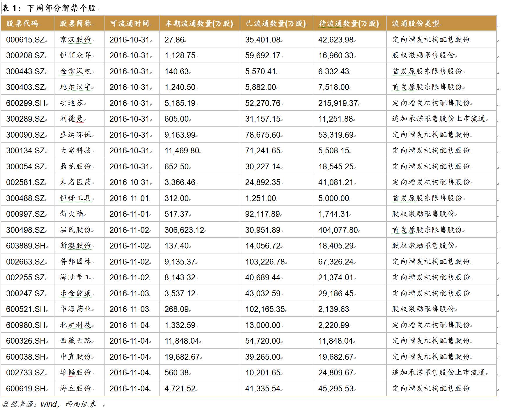 ○从风险因素来看,美联储连续加息预期与解禁抛售可能成为压制市场的重要因素。进入十月份以来,出现了快速贬值,从月初的6.67上升到了6.79,逼近6.8,在一个月内大幅度贬值约2%。这一动作将在一定程度对冲未来美国连续加息的风险。而从解禁市值来看,11、12月份是全年解禁的高峰期。各类股东有可能在未来两个月加大减持力度,这也会对市场上行构成比较严重的压力。
