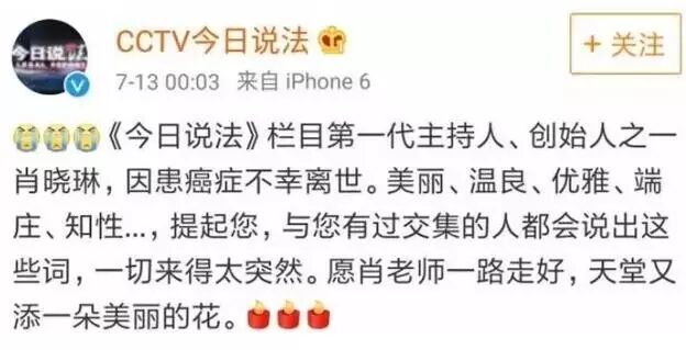 7月13日,CCTV今日说法官方微博发文悼念央视著名主持人肖晓琳的离世。
