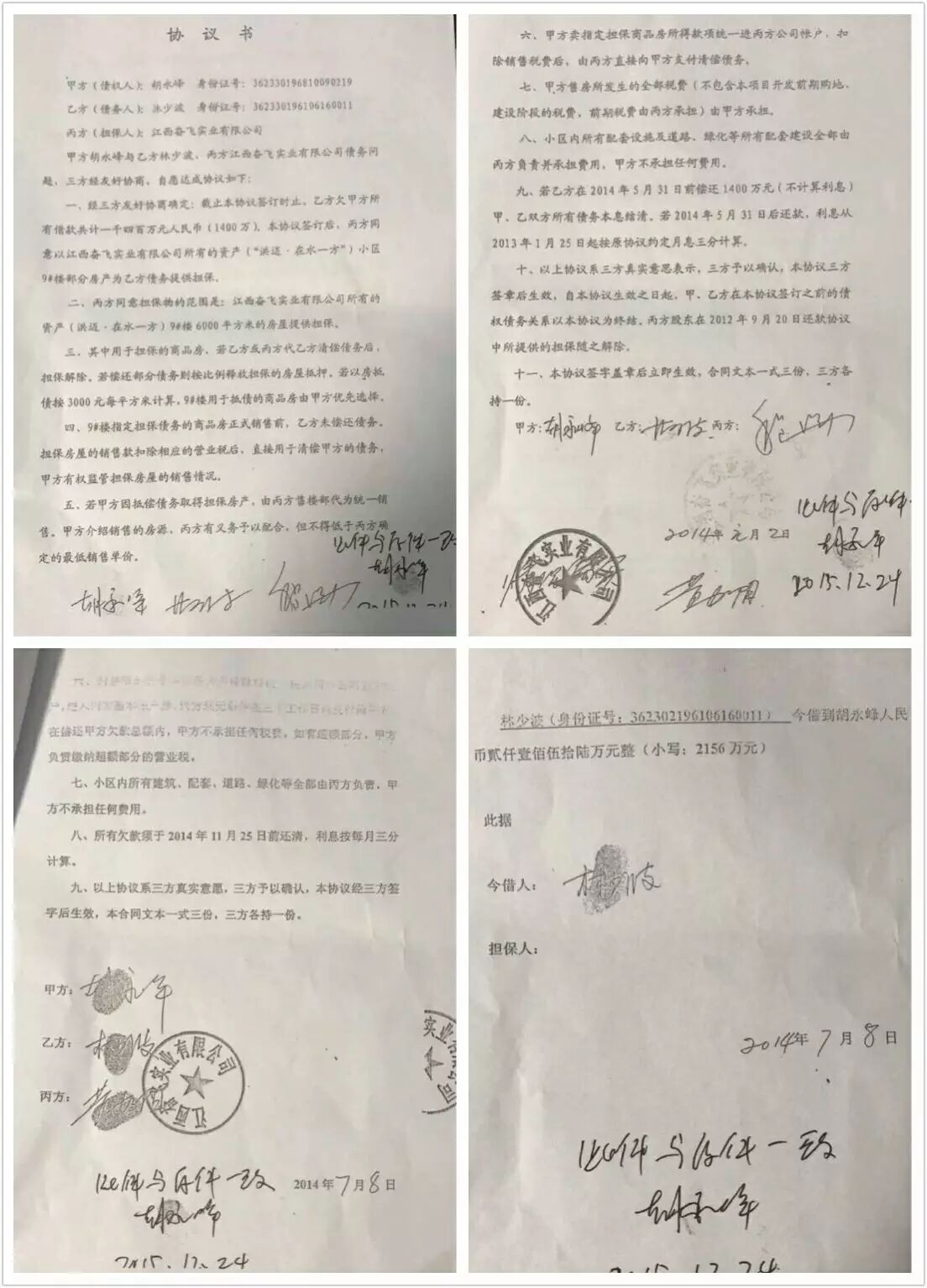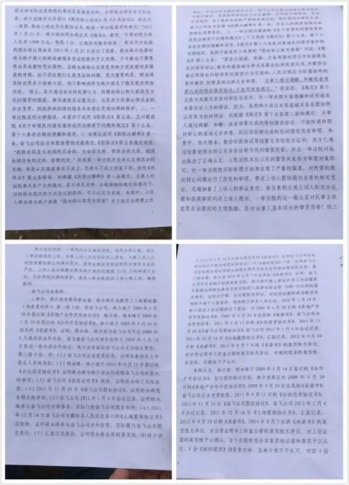 3、2012年9月20日,本人名义下24%的股权以1400万元全部转让给林少波,但当时林少波未付我一分钱,只是写了欠条和承诺书给我,并以洪迈在水一方小区9号楼做担保,当时公司股东均签字同意。至2014年7月8日,林少波仍未还款,于是我与林少波及奋飞公司共同签订了《协议书》,该协议书载明:截止本协议签订时林少波欠胡永峰所欠款本金人民币1400万和利息756万,合计欠款人民币2156万元,奋飞公司同意其“洪迈在水一方小区”17号楼全部商品房的房屋产权提供担保,所有股东均签字同意,但林少波至今仍未归还本人一分钱。