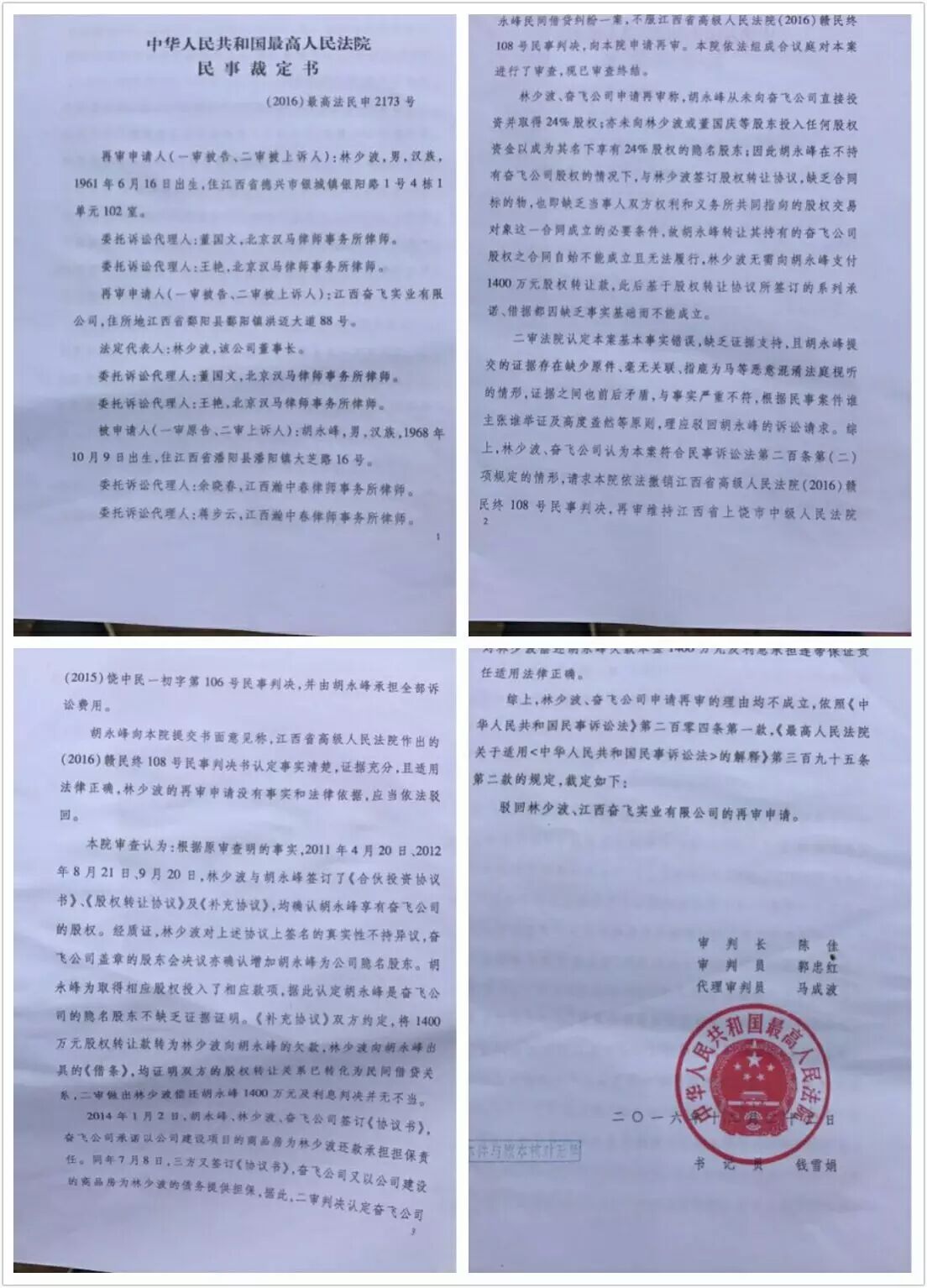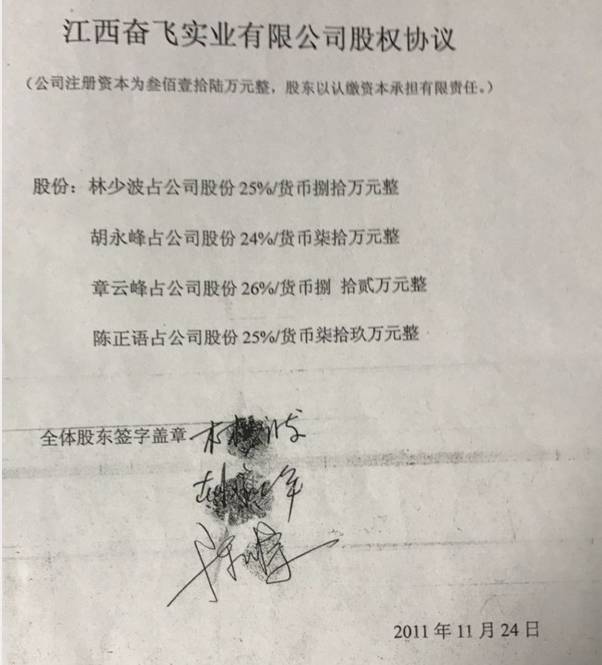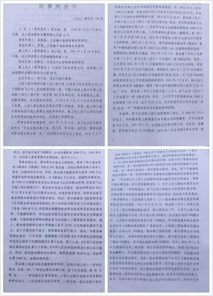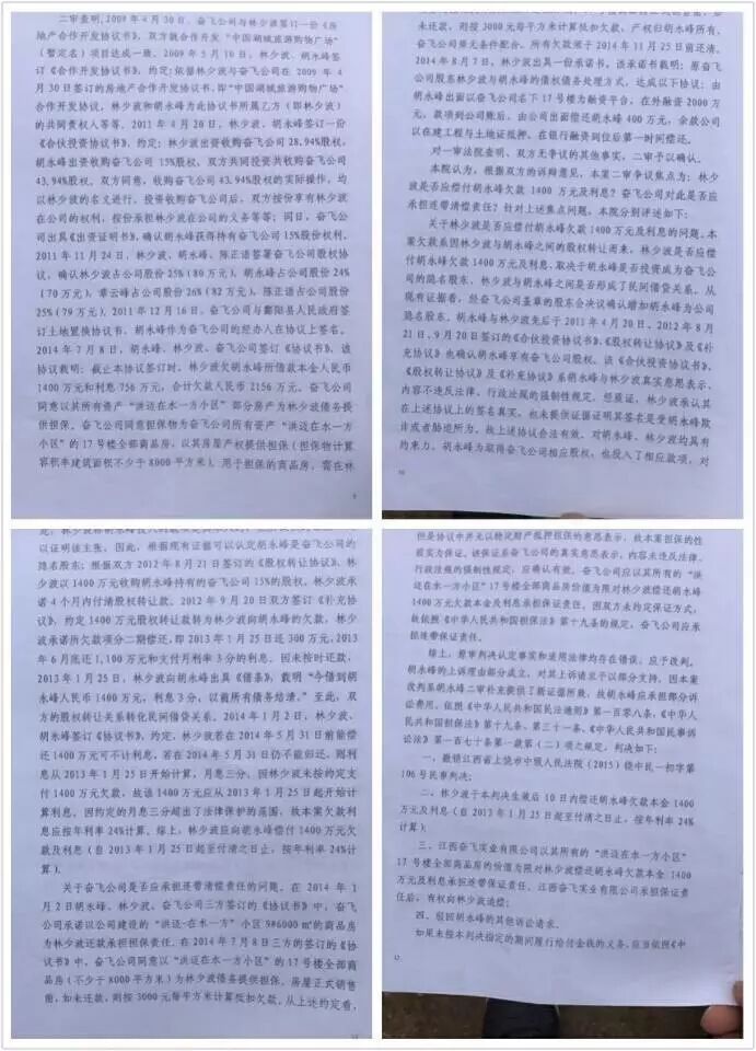 本人于2011年4月20日,2012年8月21日投资共1400万元人民币给奋飞公司,为隐名股东,与法定代表人林少波共同拥有49%的股份,本人占24%的股份,并签订相关协议。于2012年9月20日,本人名下24%的股权以1400万元人民币全部转让给林少波,当时未付款,他写了一份欠条和承诺书给我,并以郡阳洪迈在水一方小区9号楼做担保,但到期未还。不得已,,二审本人胜诉,林少波不服,申请再审,,维持二审原判,现本人正在申请执行。(林少波系江西奋飞实业有限公司的执行董事,法定代表人,于2008年在郡阳县筹建第一个楼盘为“法兰西公馆”,因经营不善,负债累累,到处逃债,该楼盘无法继续盘活。因我当时和他是好朋友,我主动提出帮他一把,并邀请其他朋友一道筹资帮他盘活该楼盘,我垫巨资帮他建完剩下的楼盘,使他起死回生)。