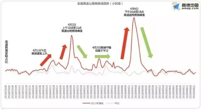 清明节假期间高速拥堵将从4月1日午后开始逐渐升高,4月2日上午高速出行需求逐渐增大,并且预计在上午10-11时左右达到峰值;小长假最后一天,也就是4月4日清明节当天祭扫出行的强度预计将达到最大,因此4月4日高速拥堵压力将达到最大,预计在下午16至18时拥堵达到第二个峰值,同时拥堵程度也将是整个清明小长假的最高峰。