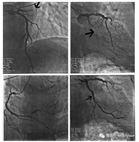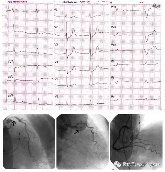 发现血压高3年。查体:血压145/90mmHg;神清,双肺呼吸音粗,双下肺闻及细湿罗音,未闻及干罗音,心率104次/分,心律绝对不齐,第一心音强弱不等,未闻及病理性杂音。入院心电图示:心房颤动,临时起搏。V1-V6呈R型,I、aVL和V7-9导联(第一个自身的QRS波群)显示出ST段抬高0.05-0.1mV。Ⅱ、Ⅲ、aVF导联ST段压低0.05-0.1mv,V1-6导联ST段压低0.1-0.3mV。冠状动脉造影显示回旋支近段完全闭塞(箭头指示)。