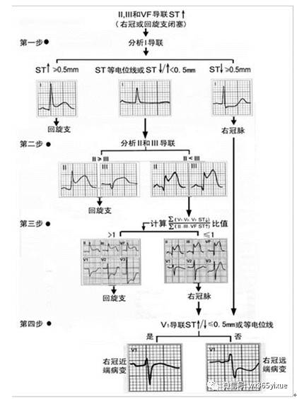 Wong[17]回顾分析对比后壁及前间壁导联ST段偏移变量,发现左前降支闭塞时,前间壁导联△ST↑远大于正后壁导联△ST↓,同样左回旋支闭塞或后壁梗死时,后壁导联△ST↑与前间壁△ST↓近似相等。欧阳南翔等分析指出急性下壁心肌梗死伴有V7~V9导联QRS波群终末变形对预测梗死相关冠状动脉:LCX较RCA发生率高(15/28比2/29),LCX的判断敏感性、特异性、阳性预测值、阴性预测值分别为53.6%、93.1%、88.2%、67.5%。