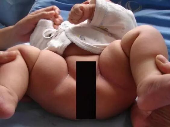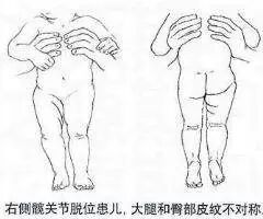 1岁以内较小儿童:双侧臀纹不对称,大腿纹不对称,大小便护理时出现髋关节弹响,患侧下肢短缩。