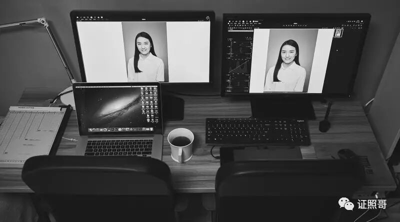 数码后期流程中会用及Macbook Pro及华硕、戴尔专业显示器,配备爱色丽校色系统,确保色彩输出的准确性。图上是双显在工作。