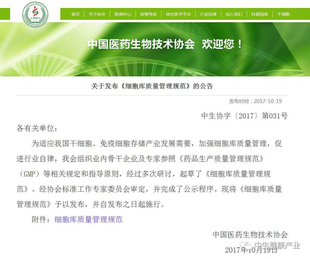 10月19日,中国医药生物技术协会发布了《细胞库质量管理规范》的公告,对大规模、长期贮存干细胞或免疫细胞的机构进行规范。中生健康生物技术专家陈阳参与起草了此项标准。