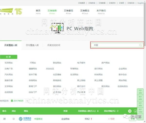 上图:艾瑞的网站排名,注意查询框中只能填入网站的名字。