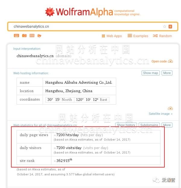 这个工具是wolframalpha.com,实际上它是一个简明百科知识的搜索引擎。在这个引擎中,当你填入一个域名的时候,它会展示Alexa认为这个网站的流量的数量的多少。在下面的例子中,看起来我的网站流量统计的偏多了。