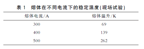 试验采用规格为500A的片状熔体,由合保电气(芜湖)有限公司提供。试验时将片状熔体按照现场实际工况安装在熔断器式隔离开关上,在开关端口处施加电流恒定的工频交流电。环境温度为20℃,在片状熔体上分别通入300A、400A和500A的电流,在熔体温度达到稳定后测量熔体的温升并记录,见表1。其中,在通以500A电流时熔体的温升为262K,此时,表面的焊锡已经熔化,但由于表面张力作用还未滴落。