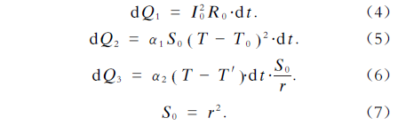 根据式(4)、式(5)和式(6),如果某种特定熔体在稳定时各部分温升基本相同,那么当其在电流有效值I的作用下达到稳定温度T时,其温升为ΔT(ΔT=T-T0),dQ3=0,根据傅里叶定律,其与某种特定介质的热交换系数α1的计算公式为