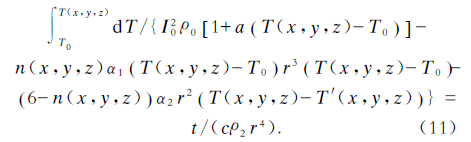 本节通过建立熔体温升过程的数学模型,得到熔体各部分温升的计算公式(11),可对其进行积分求解,最终得到熔体上某位置(x,y,z)的温度随时间的变化情况和其最终的稳定温度。