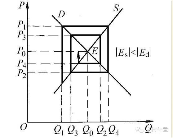 当需求量调整到Q0时,供给量调整到Q0,供给等于需求,价格下跌至最低点。但由于普通人假设下的决策滞后,人们根据p2价格做出的决策还将继续影响市场。需求量越过Q0继续向Q4,供给量跌破Q0继续向Q3移动,此时需求大于供给,价格从最低点开始上涨。
