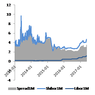 5月,,同时6月MPA考核下,整体市场利率已出现上行,货币市场与短端利率市场境内外利差维持高位,与3月的情况已然不同。在此背景下,进一步跟随美联储加息的必要性大幅减弱。,Shibor 利率进一步上行。从SHIBOR(上海银行间同业拆放利率)数据看,本周,除了三个月期SHIBOR下跌1.03个BP(近2个月来首度下行),其他期限SHIBOR仍保持连涨趋势,2周、1个月、6个月等多项期限SHIBOR昨日均创年内新高。相比之下,境外Libor利率上行有限。境内外流动性利差水平在5月之后就开始明显上行,虽然美联储加息,但整体流动性利差仍然维持高位,货币市场利差压力减小,进一步加息的需求不大。