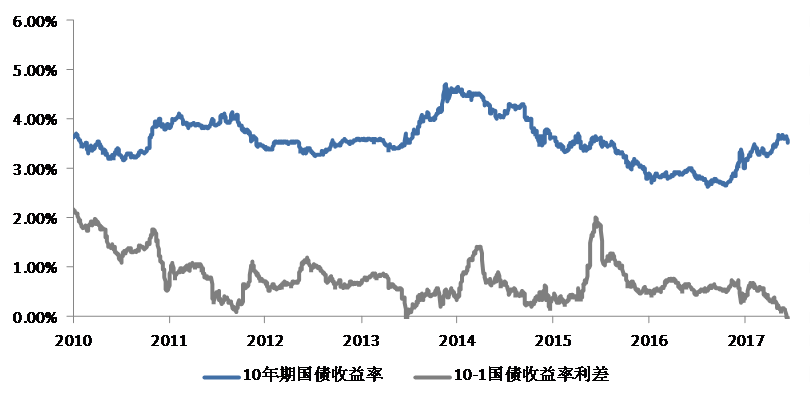 目前整体收益率曲线已经出现过平的情况,此时进一步加息不利于收益率曲线修复,对整个金融市场的冲击过于负面,因此央行也选择不在此时进一步加息。2月以来,期限利差“一压再压”。今年2月以来,国债收益率曲线开始呈现加速“平坦化”的特征,长短端期限利差不断收窄。月初,一级市场1Y、10Y关键期限国债招标,1Y国债中标利率较前一日二级市场大幅上行16bp(相比之下,10Y国债仅上行7bp),引导二级市场收益率曲线平坦化进一步加剧,10Y、1Y国债利率自2013年6月来再度出现倒挂,期限利差几乎接近历史最低水平。进入6月,10年国债与1年国债收益率四年来首次出现了倒挂,而上一次出现曲线的倒挂还要追溯到2013年6月发生“钱荒”的时候。与上一轮倒挂不同,钱荒的时候出现了短端利率飙升,这一次曲线倒挂似乎没有看到资金面紧的信号,6月以来,银行间隔夜一直稳定在2.8-2.9%之间。具体到本轮曲线平坦化,应当是一轮典型的“熊平”周期,可以看到,当前10Y国债收益率水平虽然经过了一轮“修正”,但从历史上看仍处于均值附近;但1Y国债边际上行幅度远超10Y国债,几乎快要接近历史最高水平。从政策周期看,美联储已经确认进入加息周期且存在提速的迹象,国内虽然没有进行传统意义上的“加息”动作,但在货币市场进行了“非典型性”的加息。