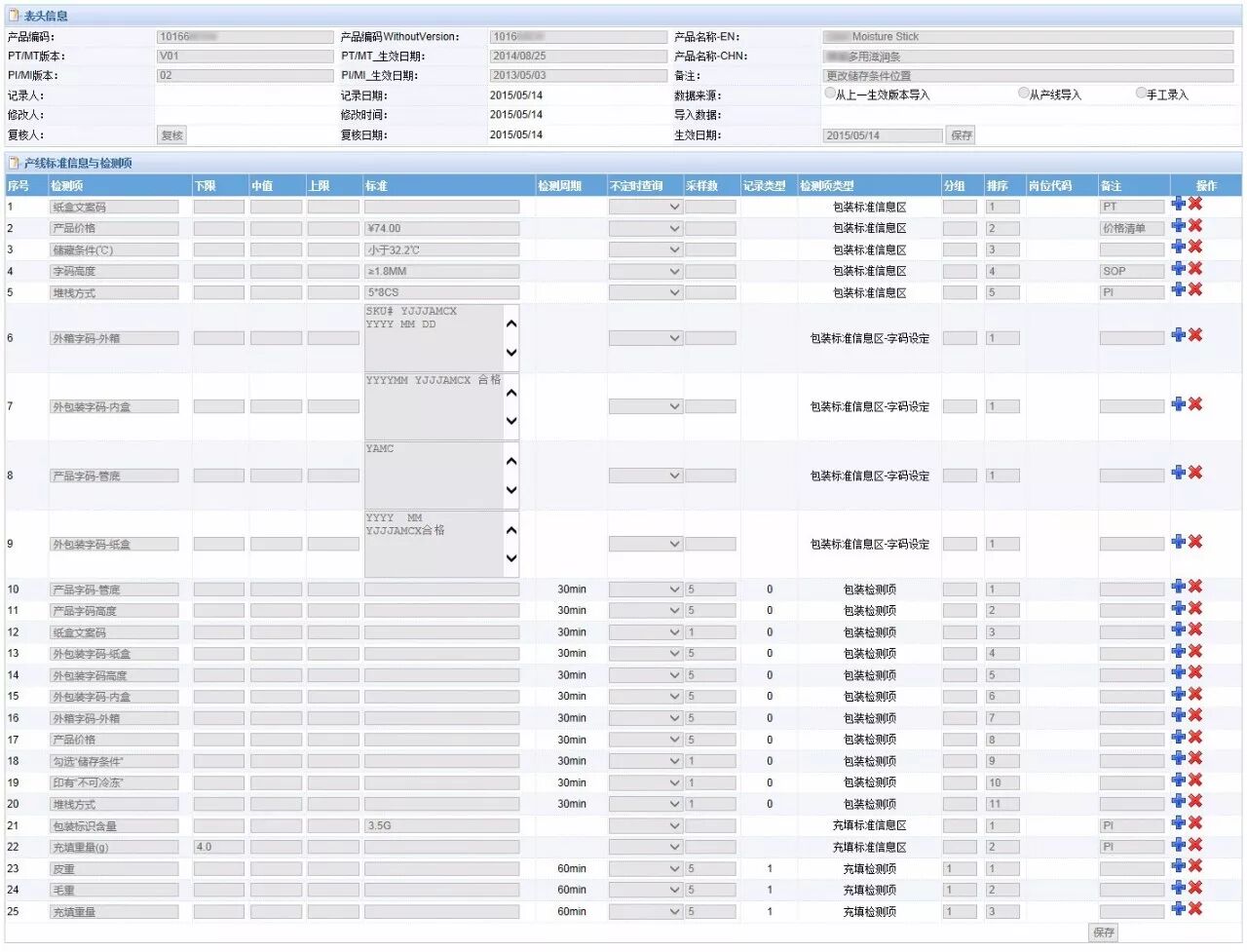 包装检测项:包括各种检测项目、检测周期、检测次数、记录类型的定义。