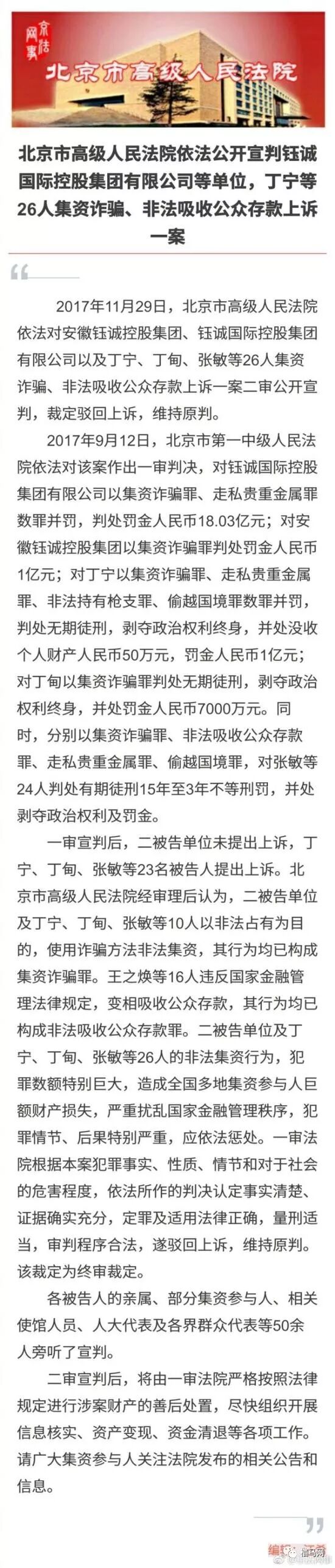 [北京市高级人民法院依法公开宣判钰诚国际控股集团有限公司等单位,丁宁等26人集资诈骗、非法吸收公众存款上诉一案]
